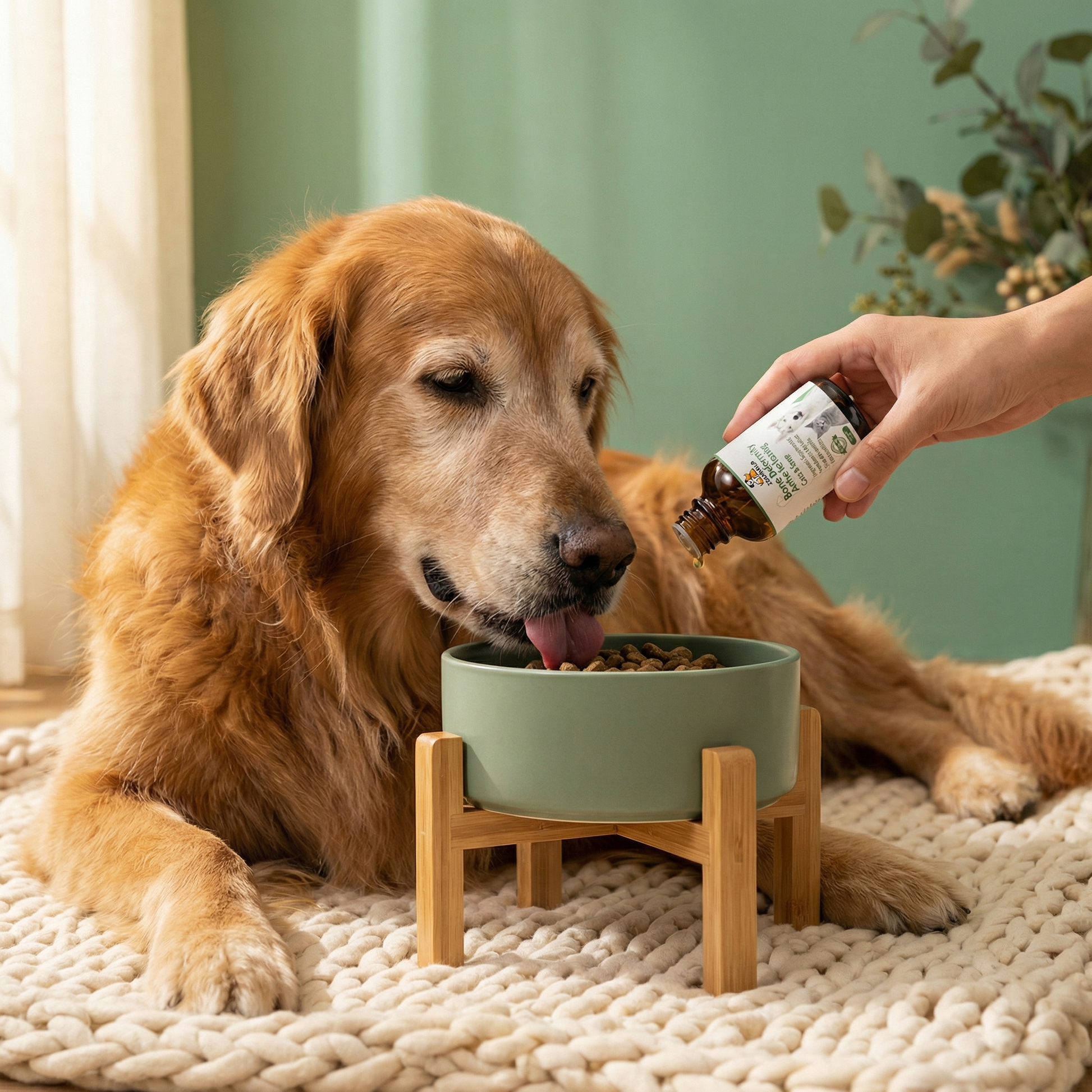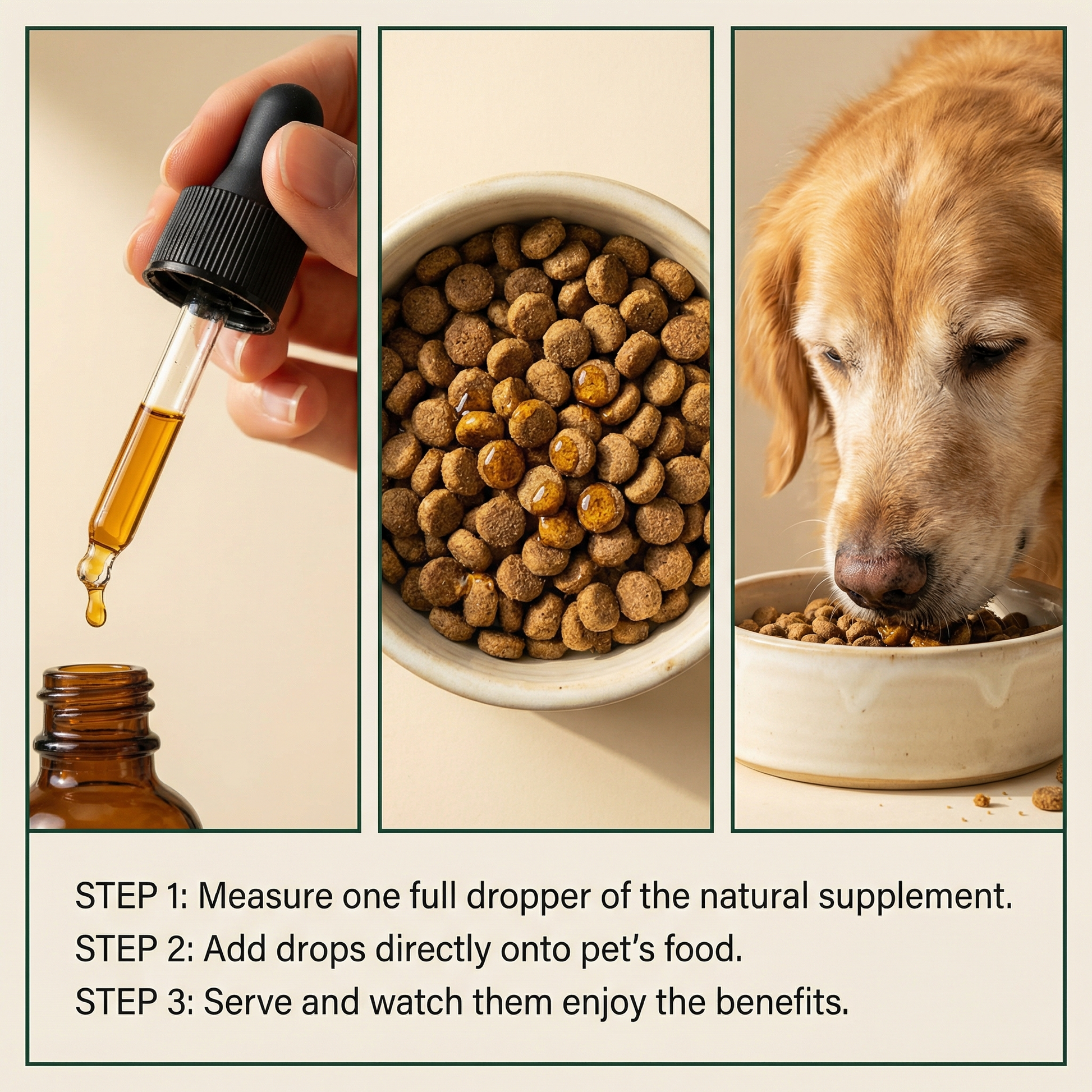 2. Add the recommended number of drops directly into your dog's food (wet food, kibble, or a small amount of low-sodium broth all work perfectly).